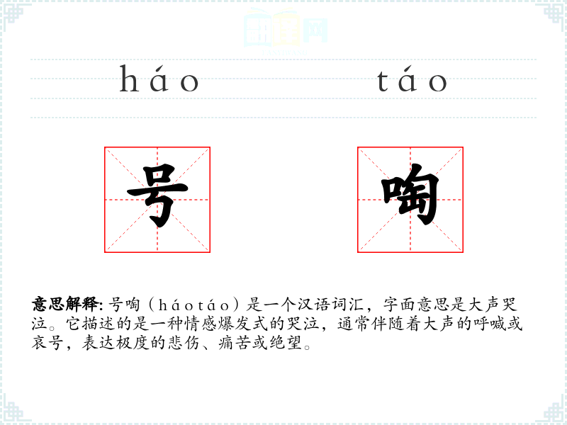 号啕(háo táo)是一个汉语词汇,字面意思是大声哭泣。它描述的是一种情感爆发式的哭泣,通常伴随着大声的呼喊或哀号,表达极度的悲伤、痛苦或绝望。