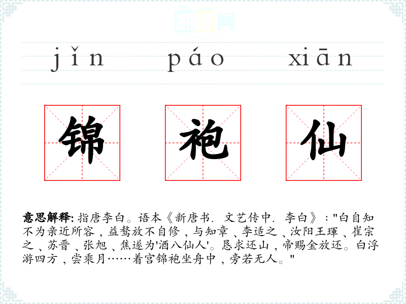 1.指唐李白。语本《新唐书.文艺传中.李白》﹕"白自知不为亲近所容﹐益骜放不自修﹐与知章﹑李适之﹑汝阳王琿﹑崔宗之﹑苏晋﹑张旭﹑焦遂为'酒八仙人'。恳求还山﹐帝赐金放还。白浮游四方﹐尝乘月……着宫锦袍坐舟中﹐旁若无人。"