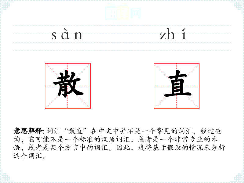 词汇“散直”在中文中并不是一个常见的词汇,经过查询,它可能不是一个标准的汉语词汇,或者是一个非常专业的术语,或者是某个方言中的词汇。因此,我将基于假设的情况来分析这个词汇。