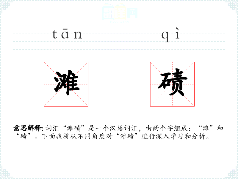 - “滩碛”是一个具有特定地理和文化含义的词汇,虽然在日常交流中不常用,但在文学和专业领域中有着重要的应用。了解和掌握这个词汇,有助于更深入地理解和欣赏汉语的丰富性和细腻性。