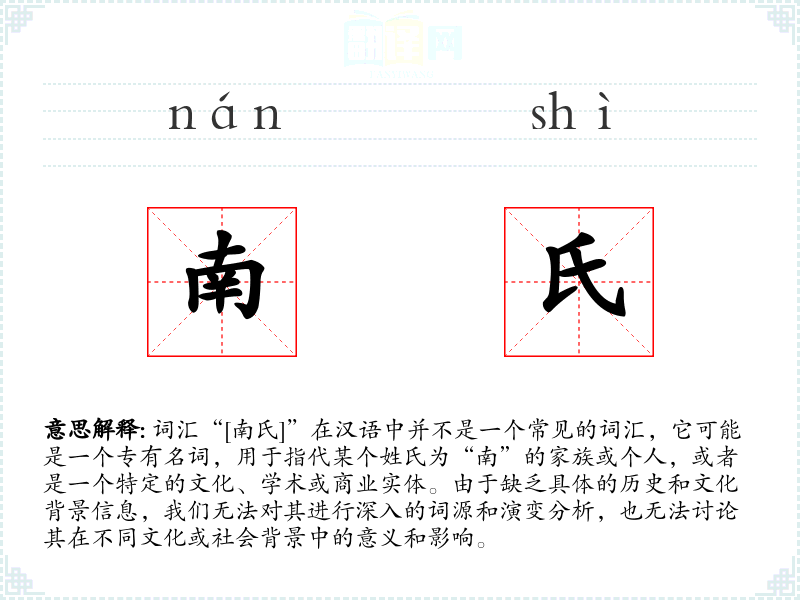 - 由于“南氏”不是一个常见的词汇,其词源和演变难以考证。
