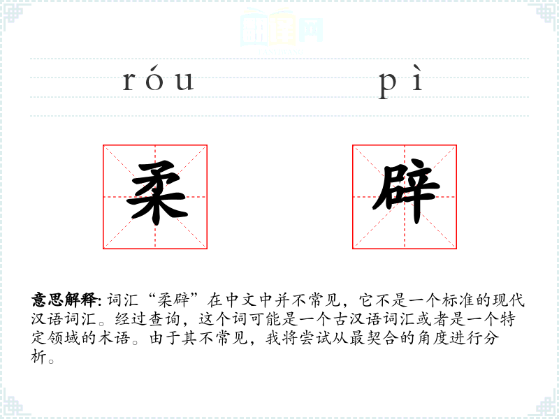 词汇“柔辟”在中文中并不常见,它不是一个标准的现代汉语词汇。经过查询,这个词可能是一个古汉语词汇或者是一个特定领域的术语。由于其不常见,我将尝试从最契合的角度进行分析。