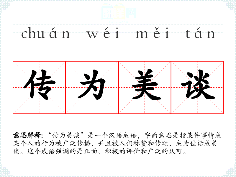 “传为美谈”是一个汉语成语,字面意思是指某件事情或某个人的行为被广泛传播,并且被人们称赞和传颂,成为佳话或美谈。这个成语强调的是正面、积极的评价和广泛的认可。