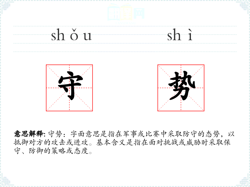 "守势"的意思解释、守势是什么意思由翻译网汉语词典查词提供。