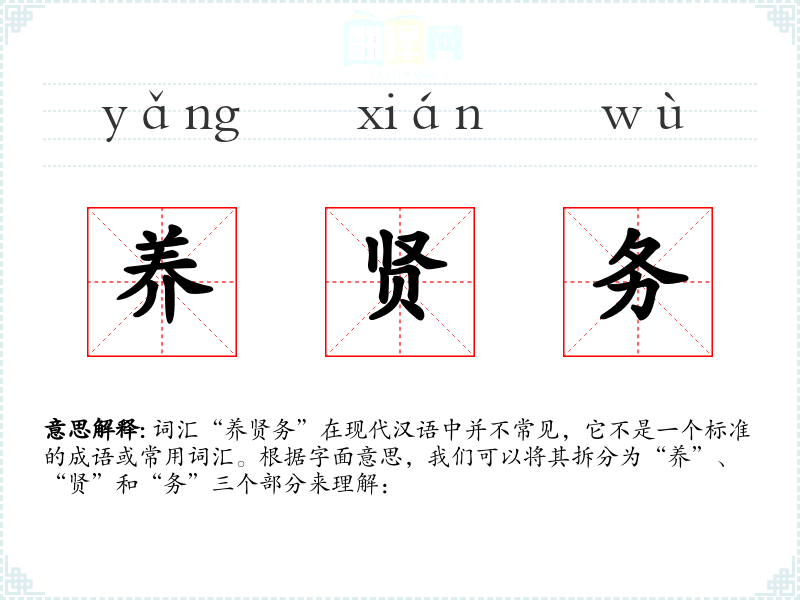 词汇“养贤务”在现代汉语中并不常见,它不是一个标准的成语或常用词汇。根据字面意思,我们可以将其拆分为“养”、“贤”和“务”三个部分来理解: