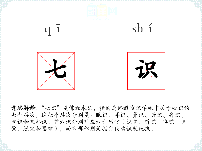 “七识”是术语,指的是唯识学派中关于心识的七个层次。这七个层次分别是:眼识、耳识、鼻识、舌识、身识、意识和末那识。前六识分别对应六种感官(视觉、听觉、嗅觉、味觉、触觉和思维),而末那识则是指自我意识或我执。
