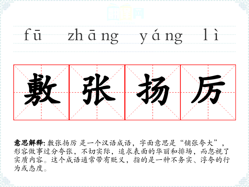 敷张扬厉 是一个汉语成语,字面意思是“铺张夸大”,形容做事过分夸张,不切实际,追求表面的华丽和排场,而忽视了实质内容。这个成语通常带有贬义,指的是一种不务实、浮夸的行为或态度。