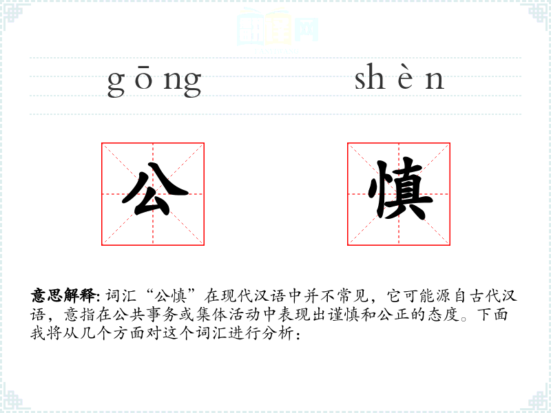词汇“公慎”在现代汉语中并不常见,它可能源自古代汉语,意指在公共事务或集体活动中表现出谨慎和公正的态度。下面我将从几个方面对这个词汇进行分析: