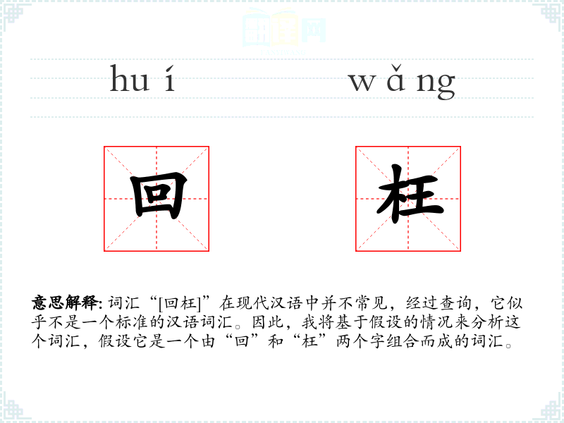 词汇“[回枉]”在现代汉语中并不常见,经过查询,它似乎不是一个标准的汉语词汇。因此,我将基于假设的情况来分析这个词汇,假设它是一个由“回”和“枉”两个字组合而成的词汇。