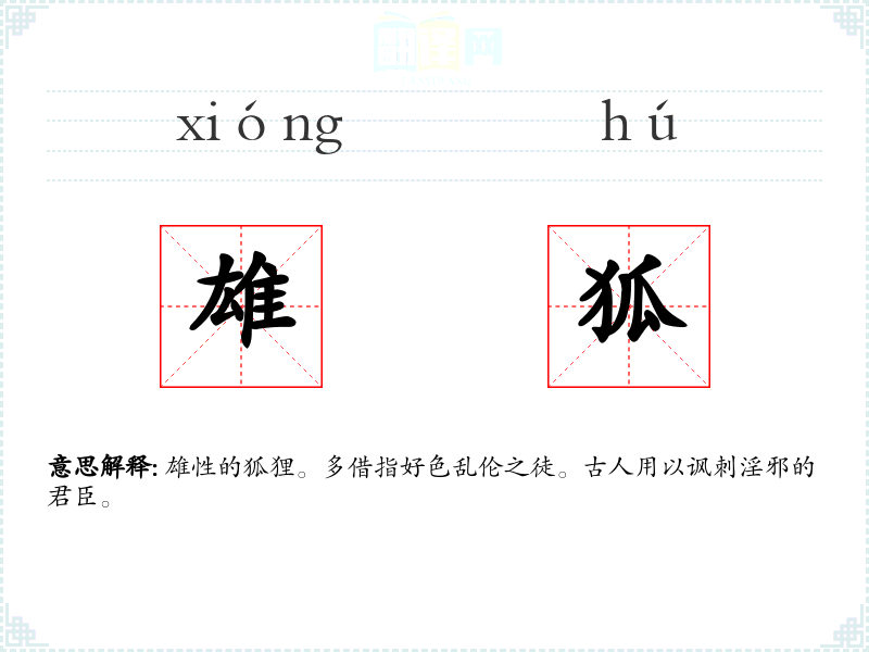 雄性的狐狸。多借指好色乱伦之徒。古人用以讽刺淫邪的君臣。