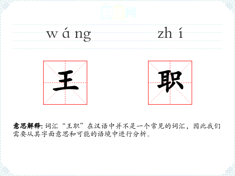 词汇“王职”在汉语中并不是一个常见的词汇,因此我们需要从其字面意思和可能的语境中进行分析。