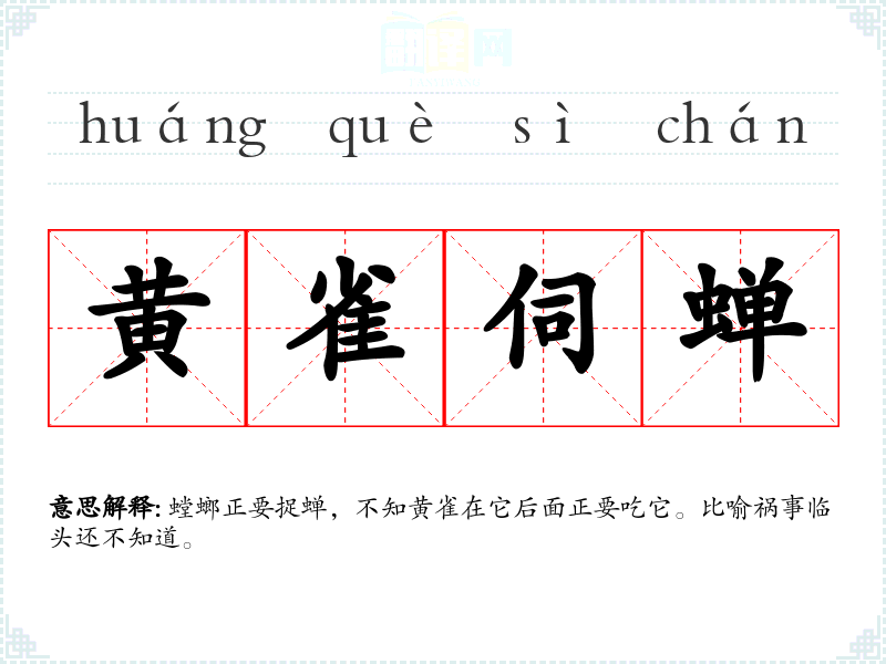 螳螂正要捉蝉,不知黄雀在它后面正要吃它。比喻祸事临头还不知道。