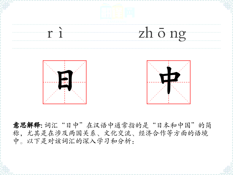 词汇“日中”在汉语中通常指的是“日本和*”的简称,尤其是在涉及两国关系、文化交流、经济合作等方面的语境中。以下是对该词汇的深入学和分析: