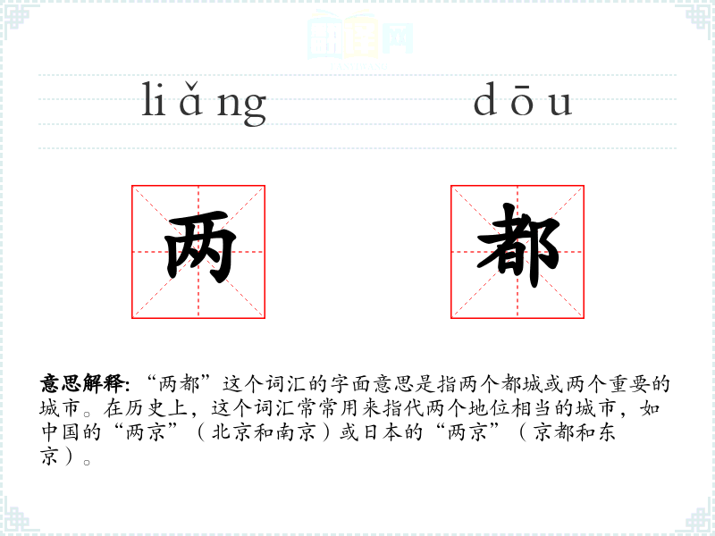 “两都”这个词汇的字面意思是指两个都城或两个重要的城市。在历史上,这个词汇常常用来指代两个地位相当的城市,如**的“两京”(北京和南京)或日本的“两京”(京都和东京)。