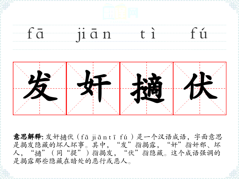 发奸擿伏(fā jiān tī fú)是一个汉语成语,字面意思是揭发隐藏的坏人坏事。其中,“发”指揭露,“奸”指奸邪、坏人,“擿”(同“提”)指揭发,“伏”指隐藏。这个成语强调的是揭露那些隐藏在暗处的恶行或恶人。