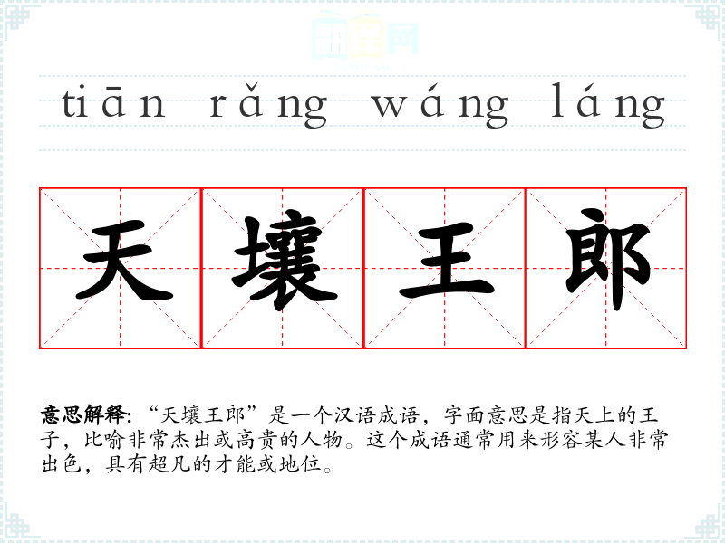 “天壤王郎”是一个汉语成语,字面意思是指天上的王子,比喻非常杰出或高贵的人物。这个成语通常用来形容某人非常出色,具有超凡的才能或地位。