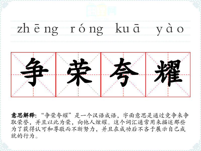 “争荣夸耀”是一个汉语成语,字面意思是通过竞争来争取荣誉,并且以此为荣,向他人炫耀。这个词汇通常用来描述那些为了获得认可和尊敬而不断努力,并且在成功后不吝于展示自己成就的行为。