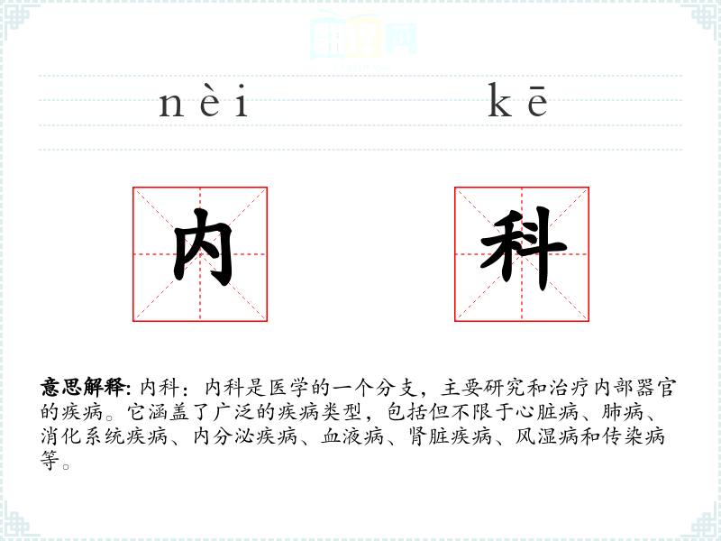 “内科”一词源自拉丁语“medicina”,意为医学。随着医学的发展,内科逐渐从医学中分离出来,成为专门研究内部疾病的学科。