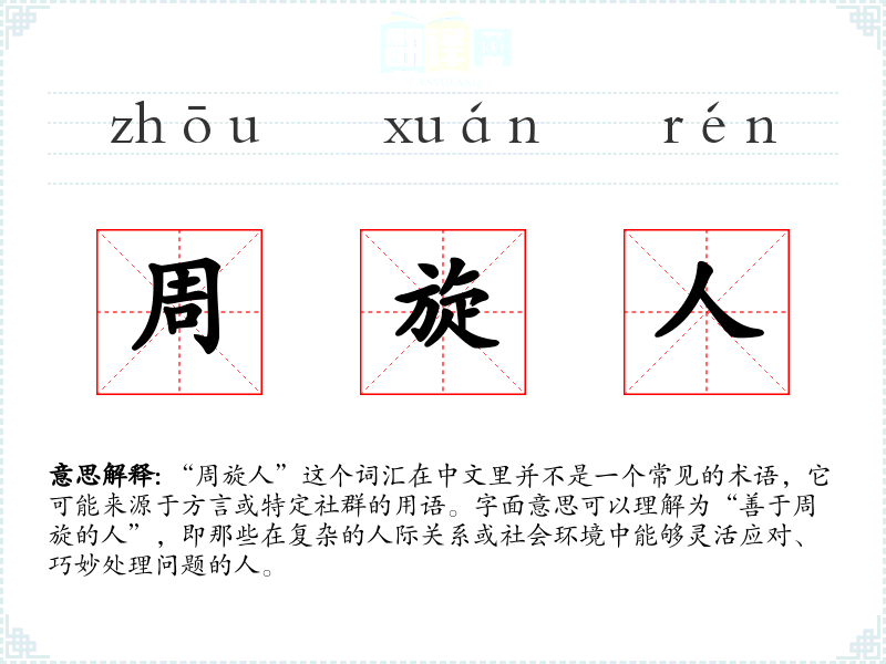 “周旋人”这个词汇在中文里并不是一个常见的术语,它可能来源于方言或特定社群的用语。字面意思可以理解为“善于周旋的人”,即那些在复杂的人际关系或社会环境中能够灵活应对、巧妙处理问题的人。