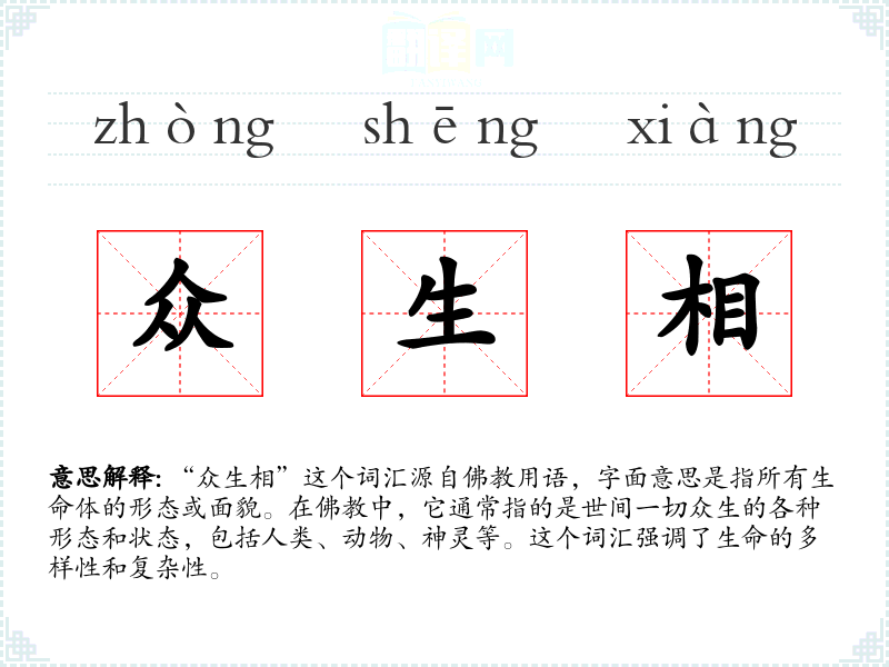 “众生相”这个词汇源自用语,字面意思是指所有生命体的形态或面貌。在中,它通常指的是世间一切众生的各种形态和状态,包括人类、动物、神灵等。这个词汇强调了生命的多样性和复杂性。