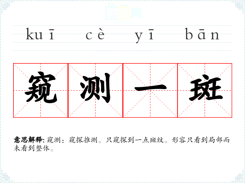 窥测:窥探推测。只窥探到一点斑纹。形容只看到局部而未看到整体。