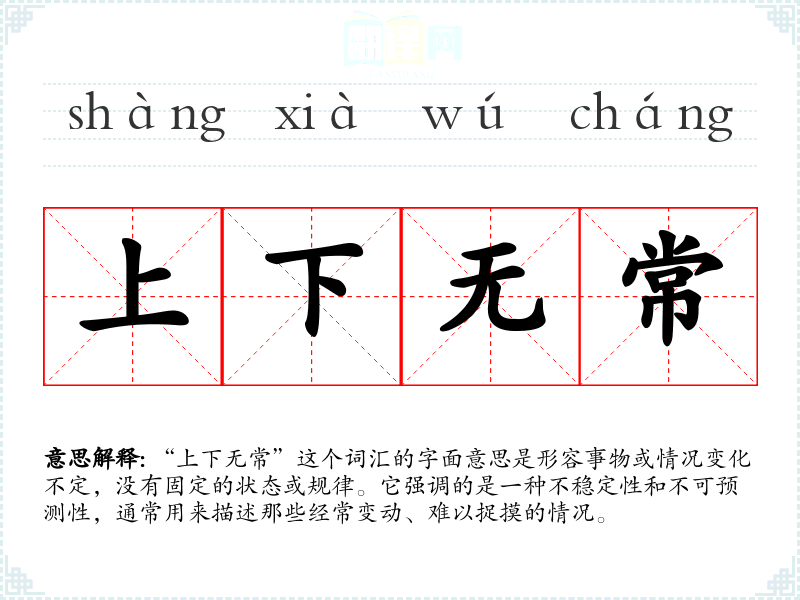 “上下无常”这个词汇的字面意思是形容事物或情况变化不定,没有固定的状态或规律。它强调的是一种不稳定性和不可预测性,通常用来描述那些经常变动、难以捉摸的情况。