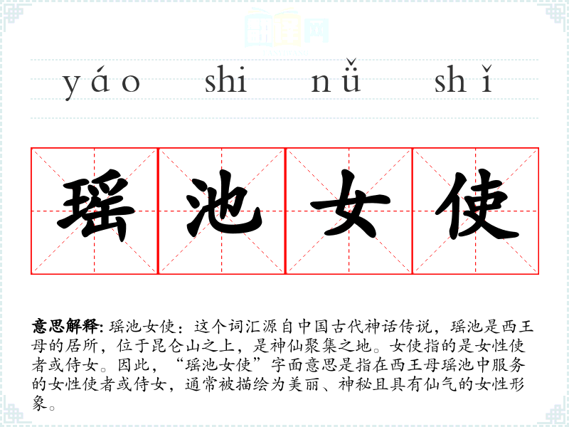 瑶池女使:这个词汇源自**古代神话传说,瑶池是西王母的居所,位于昆仑山之上,是神仙聚集之地。女使指的是女性使者或侍女。因此,“瑶池女使”字面意思是指在西王母瑶池中服务的女性使者或侍女,通常被描绘为美丽、神秘且具有仙气的女性形象。