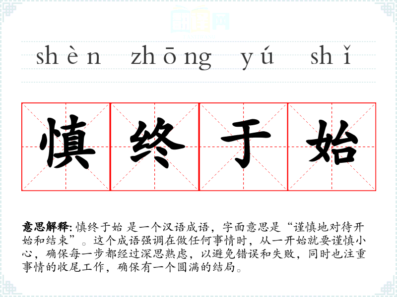 慎终于始 是一个汉语成语,字面意思是“谨慎地对待开始和结束”。这个成语强调在做任何事情时,从一开始就要谨慎小心,确保每一步都经过深思熟虑,以避免错误和失败,同时也注重事情的收尾工作,确保有一个圆满的结局。