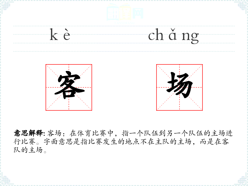客场:在体育比赛中,指一个队伍到另一个队伍的主场进行比赛。字面意思是指比赛发生的地点不在主队的主场,而是在客队的主场。