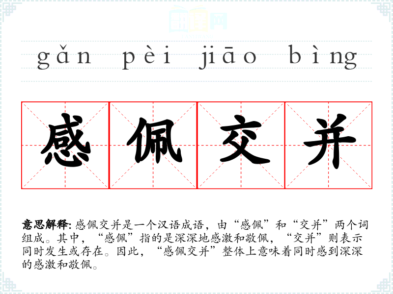 感佩交并是一个汉语成语,由“感佩”和“交并”两个词组成。其中,“感佩”指的是深深地感激和敬佩,“交并”则表示同时发生或存在。因此,“感佩交并”整体上意味着同时感到深深的感激和敬佩。