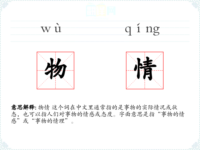 物情 这个词在中文里通常指的是事物的实际情况或状态,也可以指人们对事物的情感或态度。字面意思是指“事物的情感”或“事物的情理”。