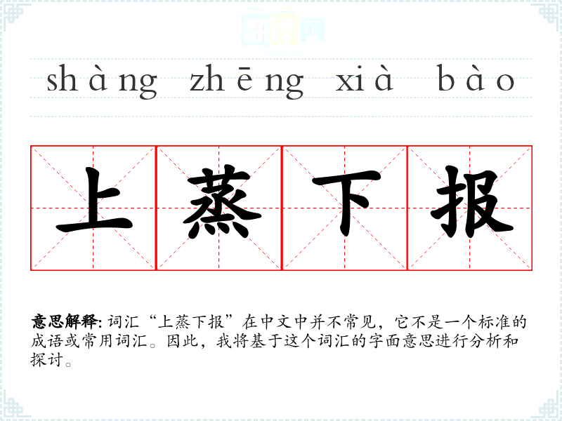 词汇“上蒸下报”在中文中并不常见,它不是一个标准的成语或常用词汇。因此,我将基于这个词汇的字面意思进行分析和探讨。