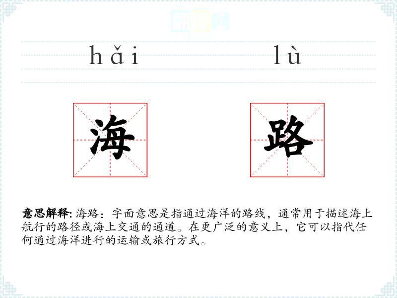 海路:字面意思是指通过海洋的路线,通常用于描述海上航行的路径或海上交通的通道。在更广泛的意义上,它可以指代任何通过海洋进行的运输或旅行方式。