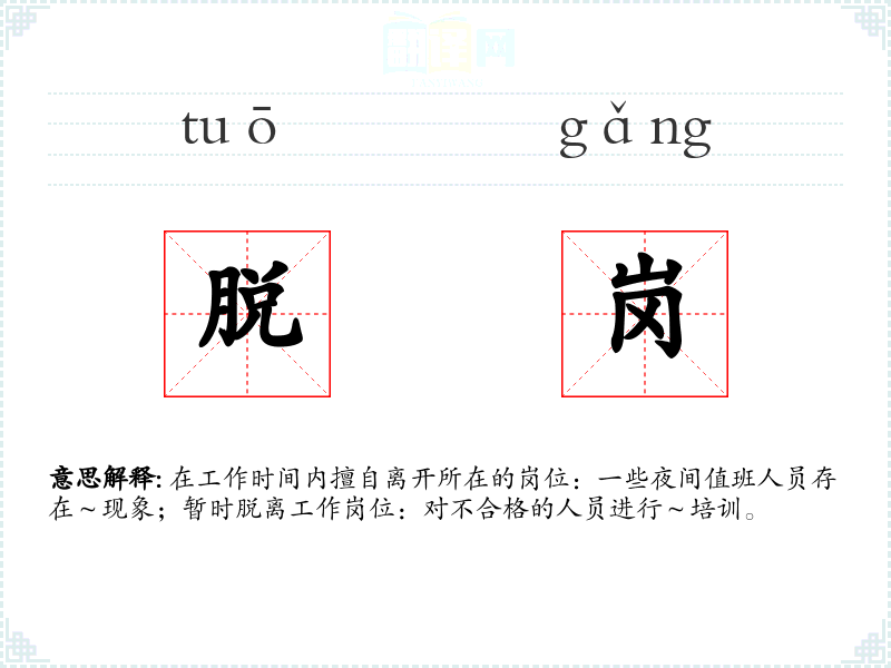 在工作时间内擅自离开所在的岗位:一些夜间值班人员存在~现象;暂时脱离工作岗位:对不合格的人员进行~培训。