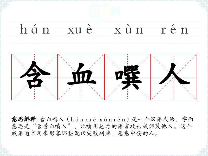 含血噀人(hán xuè xùn rén)是一个汉语成语,字面意思是“含着血喷人”,比喻用恶毒的语言攻击或诬蔑他人。这个成语通常用来形容那些说话尖酸刻*、恶意中伤的人。