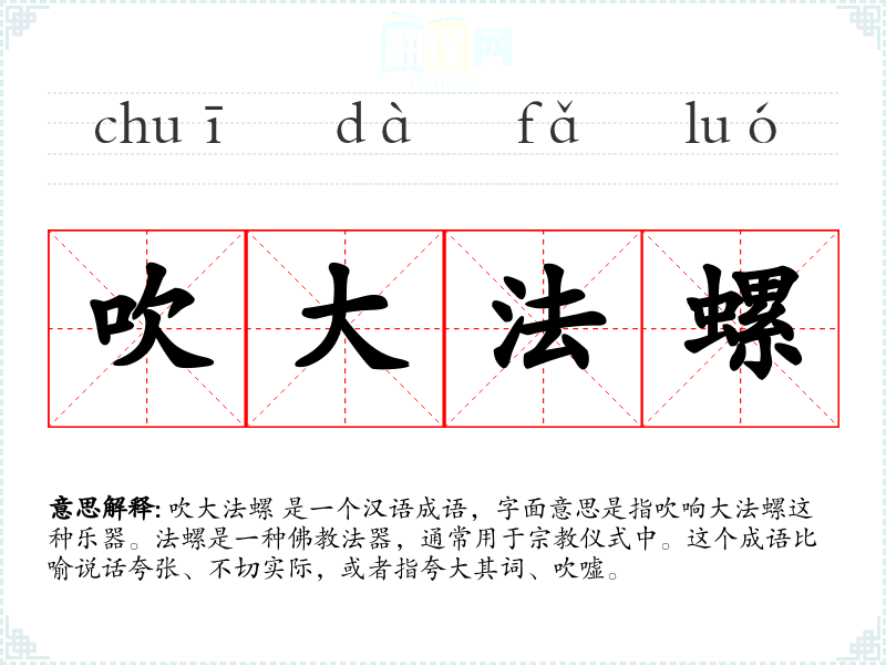 吹大法螺 是一个汉语成语,字面意思是指吹响大法螺这种乐器。法螺是一种法器,通常用于仪式中。这个成语比喻说话夸张、不切实际,或者指夸大其词、吹嘘。