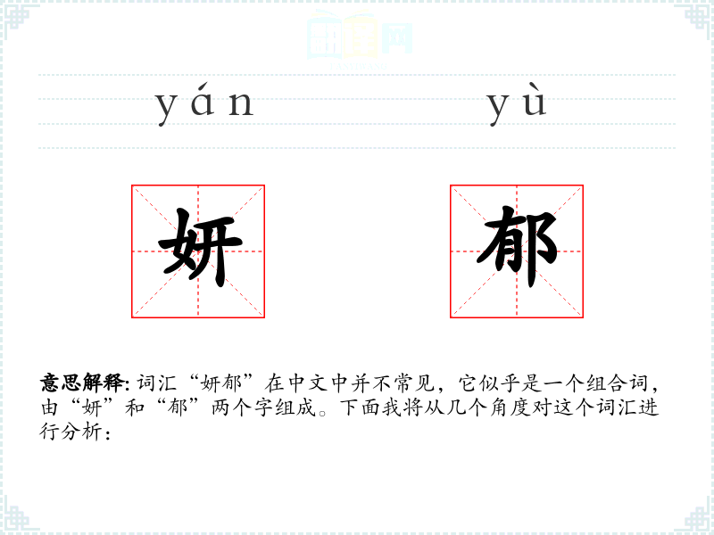词汇“妍郁”在中文中并不常见,它似乎是一个组合词,由“妍”和“郁”两个字组成。下面我将从几个角度对这个词汇进行分析: