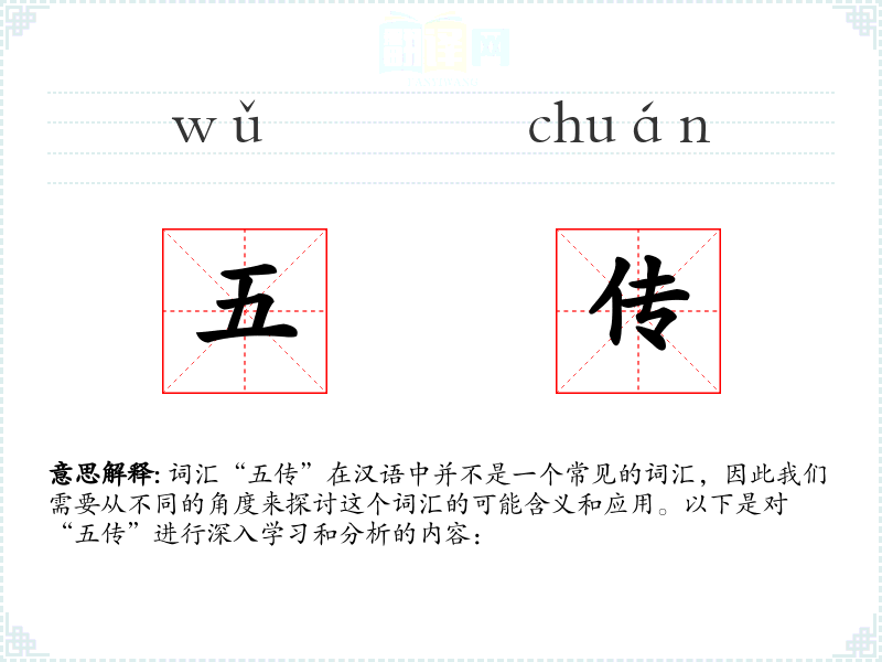 词汇“五传”在汉语中并不是一个常见的词汇,因此我们需要从不同的角度来探讨这个词汇的可能含义和应用。以下是对“五传”进行深入学*和分析的内容: