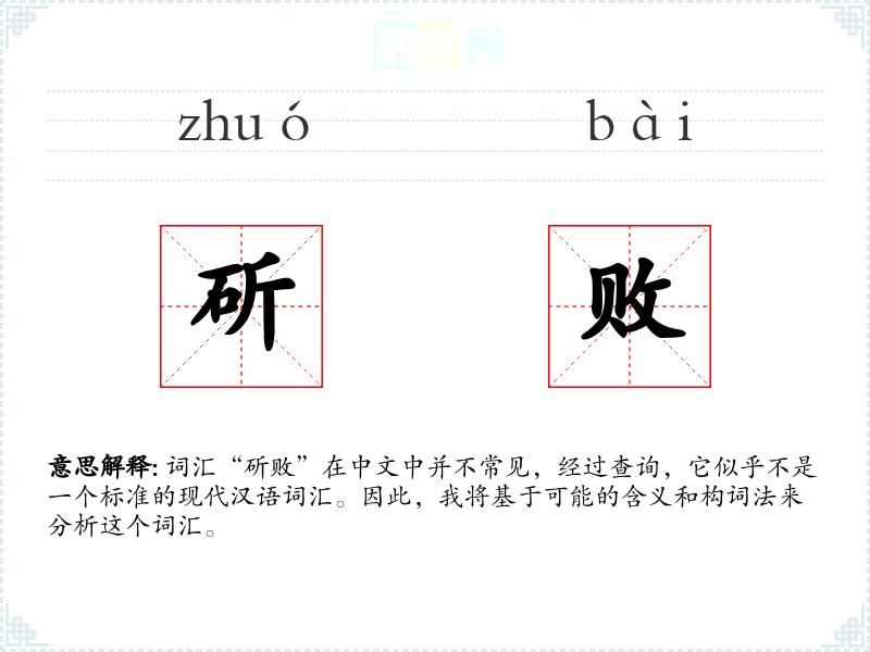 词汇“斫败”在中文中并不常见,经过查询,它似乎不是一个标准的现代汉语词汇。因此,我将基于可能的含义和构词法来分析这个词汇。