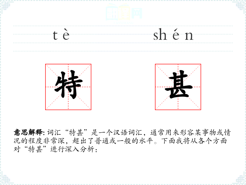 词汇“特甚”是一个汉语词汇,通常用来形容某事物或情况的程度非常深,超出了普通或一般的水平。下面我将从各个方面对“特甚”进行深入分析: