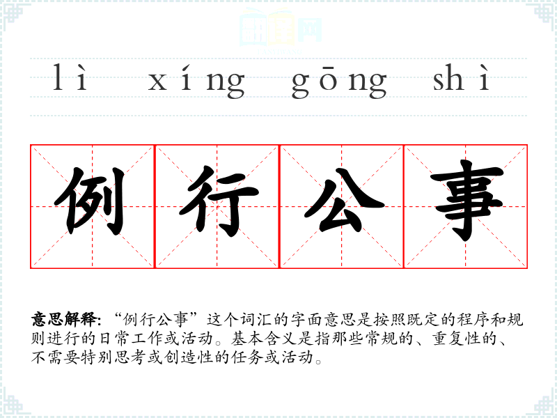 “例行公事”这个词汇的字面意思是按照既定的程序和规则进行的日常工作或活动。基本含义是指那些常规的、重复性的、不需要特别思考或创造性的任务或活动。