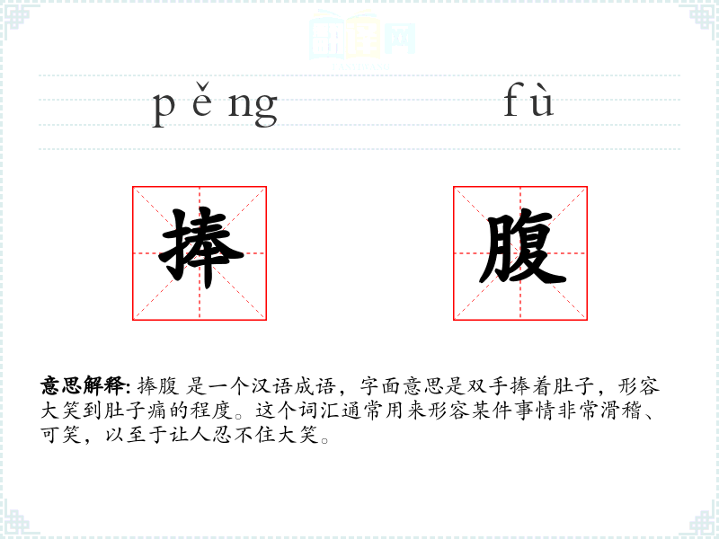 捧腹 是一个汉语成语,字面意思是双手捧着肚子,形容大笑到肚子痛的程度。这个词汇通常用来形容某件事情非常滑稽、可笑,以至于让人忍不住大笑。
