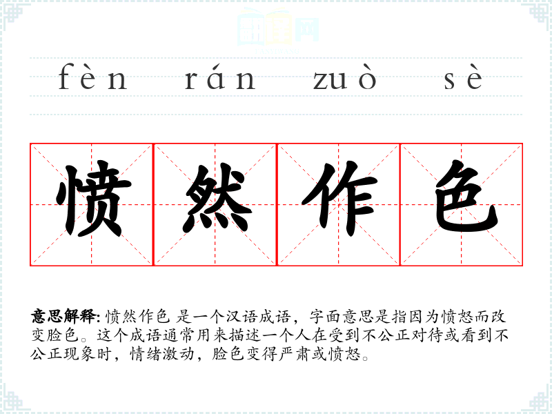 愤然作色 是一个汉语成语,字面意思是指因为愤怒而改变脸色。这个成语通常用来描述一个人在受到不公正对待或看到不公正现象时,情绪激动,脸色变得严肃或愤怒。