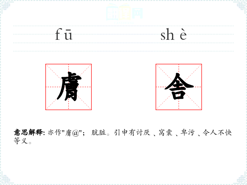 亦作"膚@"; 肮脏。引申有讨厌﹑窝囊﹑卑污﹑令人不快等义。