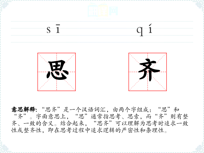 “思齐”是一个汉语词汇,由两个字组成:“思”和“齐”。字面意思上,“思”通常指思考、思索,而“齐”则有整齐、一致的含义。结合起来,“思齐”可以理解为思考时追求一致性或整齐性,即在思考过程中追求逻辑的严密性和条理性。