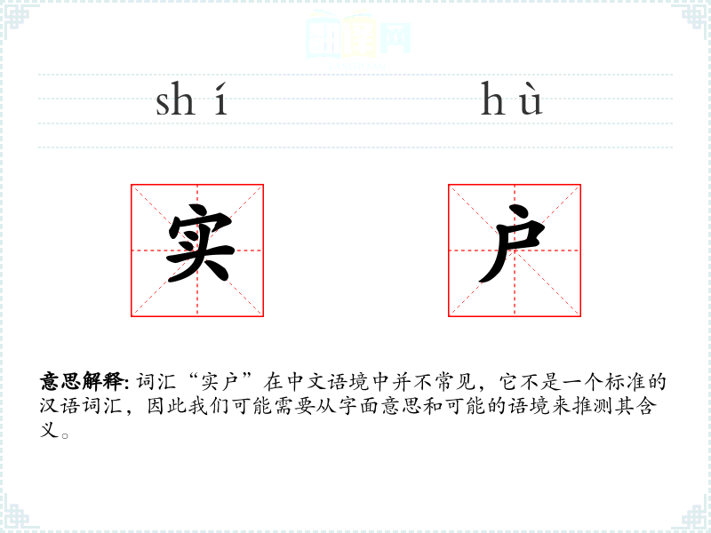 词汇“实户”在中文语境中并不常见,它不是一个标准的汉语词汇,因此我们可能需要从字面意思和可能的语境来推测其含义。
