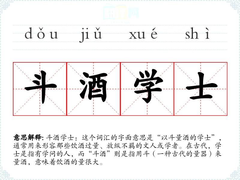 斗酒学士:这个词汇的字面意思是“以斗量酒的学士”,通常用来形容那些饮酒过量、放纵不羁的文人或学者。在古代,学士是指有学问的人,而“斗酒”则是指用斗(一种古代的量器)来量酒,意味着饮酒的量很大。
