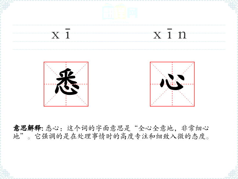 悉心:这个词的字面意思是“全心全意地,非常细心地”。它强调的是在处理事情时的高度专注和细致入微的态度。