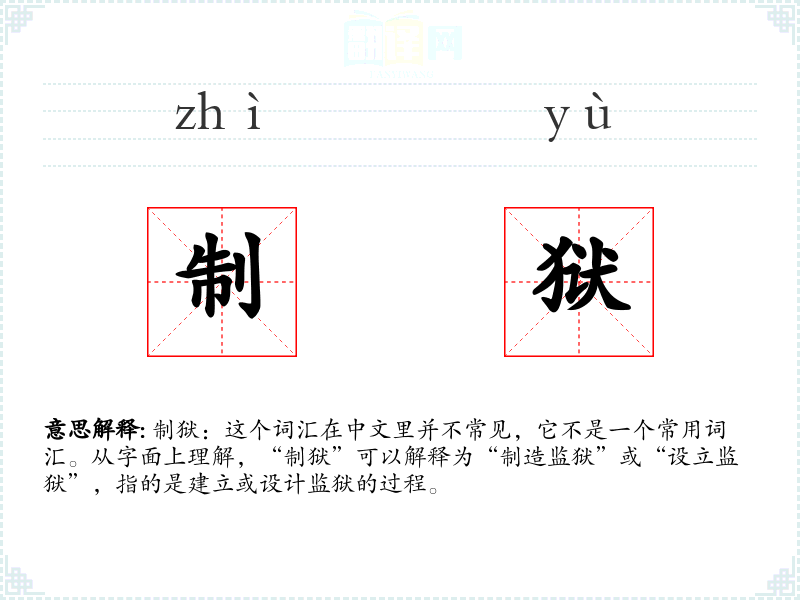 制狱:这个词汇在中文里并不常见,它不是一个常用词汇。从字面上理解,“制狱”可以解释为“制造监狱”或“设立监狱”,指的是建立或设计监狱的过程。