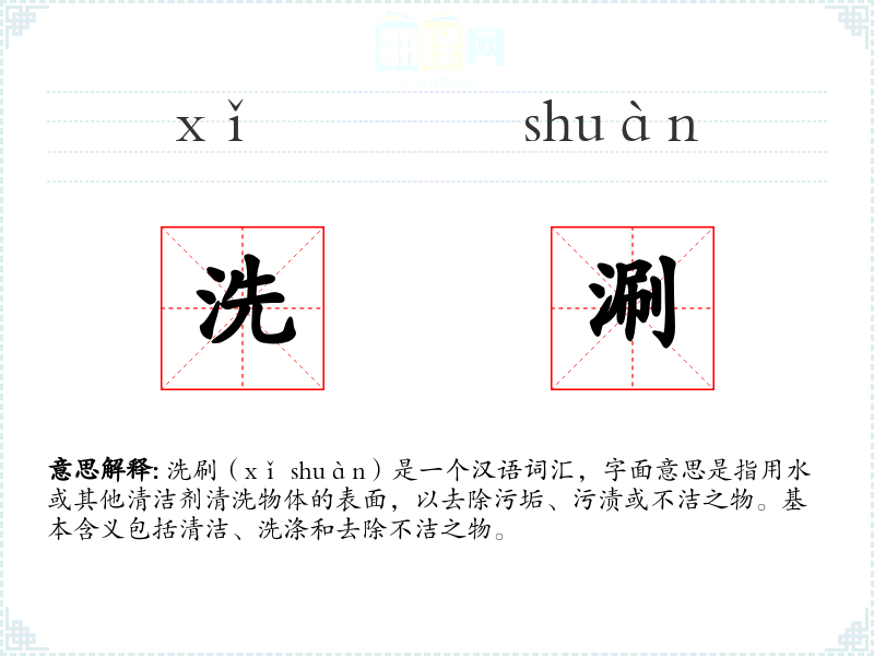 洗刷(xǐ shuàn)是一个汉语词汇,字面意思是指用水或其他清洁剂清洗物体的表面,以去除污垢、污渍或不洁之物。基本含义包括清洁、洗涤和去除不洁之物。